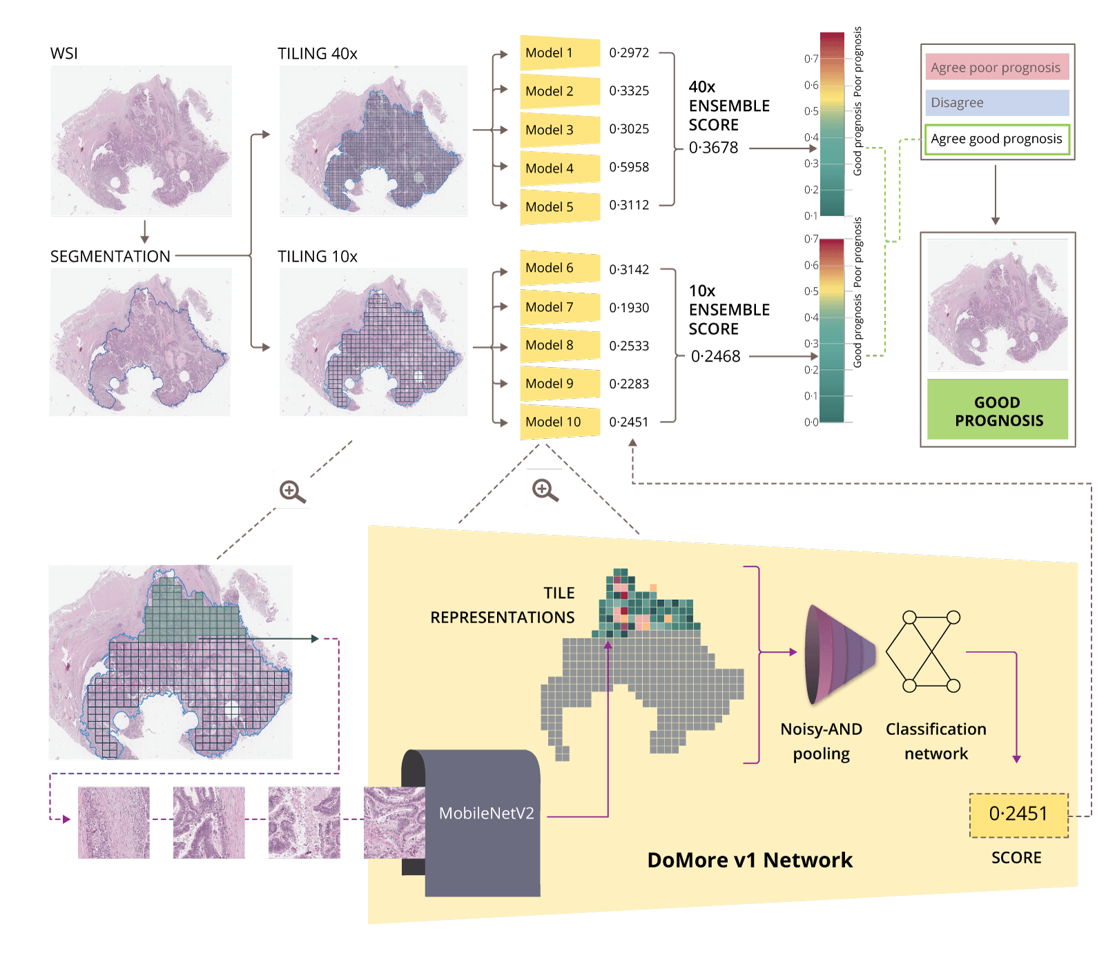 We first developed Histotyping in colorectal cancer and published the results in The Lancet in February 2020. The DoMore-v1-CRC biomarker was developed from scanned HE-sections from 2500 colorectal cancer (CRC) patients with more than 12 000 000 image tiles from patients with a distinctly good or poor disease outcome from four cohorts were used to train a total of ten convolutional neural networks, purpose-built for classifying supersized heterogeneous images. A prognostic biomarker integrating the ten networks was determined using patients with a non-distinct outcome. The marker was tested on 920 patients with slides prepared in the UK, and then independently validated according to a predefined protocol in 1122 patients treated with single-agent capecitabine, using slides prepared in Norway. All cohorts included only patients with resectable tumours, and a formalin-fixed, paraffin-embedded tumour tissue block available for analysis. The primary outcome was cancer-specific survival.