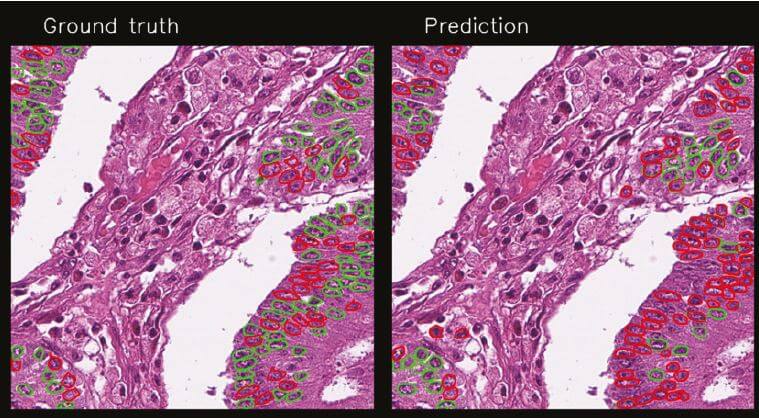 A new concept for training deep learning networks has recently been introduced at the institute. We are staining tissue sections with HE for routine diagnostics, scanning the section, removing the stain and then re-staining the section using IHC. In this way, we can identify cells of interest, transferring the identification to the same cells in the HE-stained section and use this identification to train a deep learning network to recognise the cells of interest directly in the routine diagnostic section. If we succeed in developing an algorithm for a given cell or cellular feature, they can be automatically scored in routine diagnostic sections. Early results with Ki67 were very promising, but there was room for improvement. Through more clearly identifying the cells expressing Ki67 by drawing around them, a new training set was created from 900 tiles (800x800 pixels) selected randomly from 100 patient samples, and all positive and negative epithelial tumour cell nuclei were drawn around in 308 image tiles using proprietary software (Nline), resulting in 38 715 scored objects. These were used to train a Mask R-CNN model.